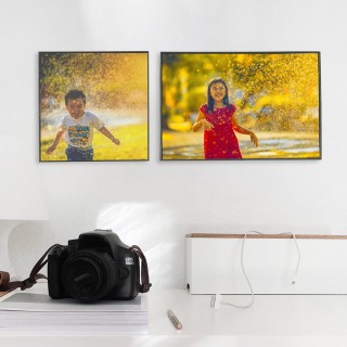 Trasforma le tue fotografie in quadri pronti da appendere o appoggiare. La particolare superficie ruvida dona alle tue immagini un effetto pittorico. Il montaggio dell'immagine senza vetro su supporto antigraffio resistente all'acqua* e alla polvere, rende questo oggetto adatto ad ogni ambiente.