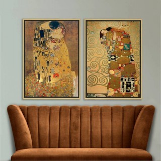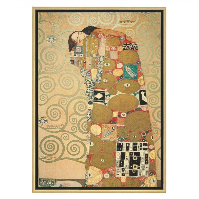 Il cartoncino metallizzato dona all'immagine riflessi dorati e colpi di luce per rappresentare la ricchezza decorativa delle opere del Maestro. Montaggio in cornice oro e nero senza vetro, con vernice antigraffio